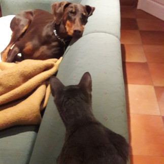 Dixie was soon curious to know whom she saved and was very happy to finally meet a cat that didn't treat it as if it was just some sort of dog. Cayenne was too young to know better, but much better off for it. Because, even if Cayenne didn't realise it yet, Dixie would be her protector, for life. And that's when it got interesting. Dixie had been trying to convince the Gringos she was just a sweet dobbie who liked to run after cats, or lick those that didn't run. Tom didn't run. Winnie didn't run, she hid. Patch on the other hand was the youngest. She was the baby, she was the chouchou. Until that dog and new kitten came along, she was the 'favorite'.