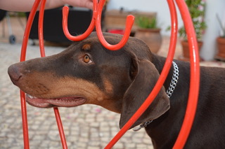 Dixie's family name comes from the association we got her from. Dobbie Hope is a dog rescue operation specialised in the Dobermann breed. Dixie was bought by a young couple living in an apartment in Lisbon. But then she grew too fast, as dobbies do. A big dog alone in a small apartment is not ideal. This one started chewing on it's own tail, to the blood. It became a medical issue. The young couple asked Dobie Hope for help just about the time I had posted a request to Facebook groups looking for a young female Dobermann. Elektra, as her name was then, was brought to us at our doorstep. It was love at first sight :-)